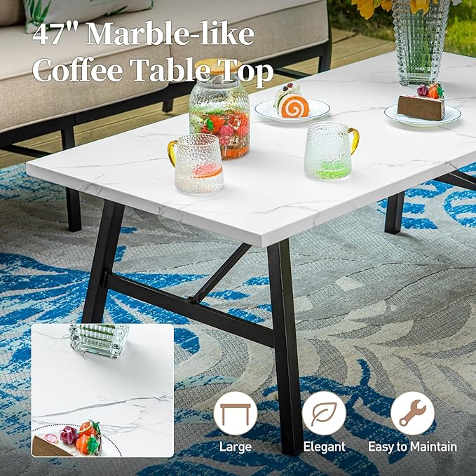 - ALL WEATHER HEAVY-DUTY FRAME: This metal backyard furniture set is made of high-performance E-COATING and POWDER-COATING dual rust prevention techniques that are All weather resistant, anti-rust, and easy to clean, with no special care needed. That patio conversation set has a heavy-duty wrought iron metal frame, The single chairs could support up to 350 lbs weight and the 3-seater sofa supports 900 lbs