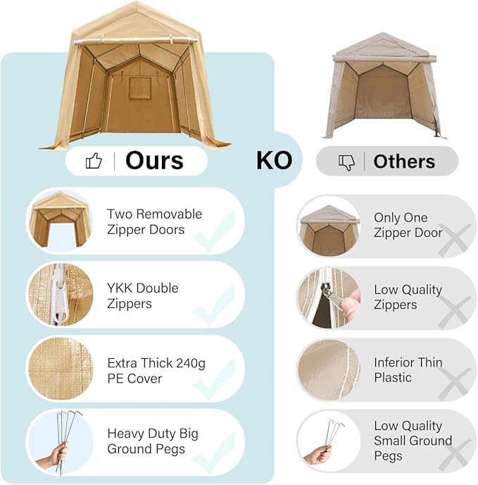 - 【Heavy Duty Durable Frame】✔1-1/2-inch diameter steel poles provide stability and strength to make the storage shelter carport safer. The garage storage tent is equipped with upgraded 0.32X11.81 inch (8X300mm) L-Type pegs, thickened and enlarged to increase stability.