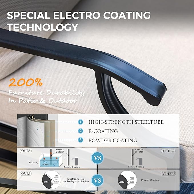- 【RELIABLE ALL-WEATHER METAL CONSTRUCTION】Built from durable metal with E-COATING and POWDER-COATING finish, ensuring resistance to all weather conditions, rust-proof qualities, and easy maintenance. The sturdy wrought iron frame can withstand various weather conditions, with the single chairs supporting up to 350 lbs and the 3-seater sofa accommodating up to 900 lbs, promising long-lasting reliability and durability