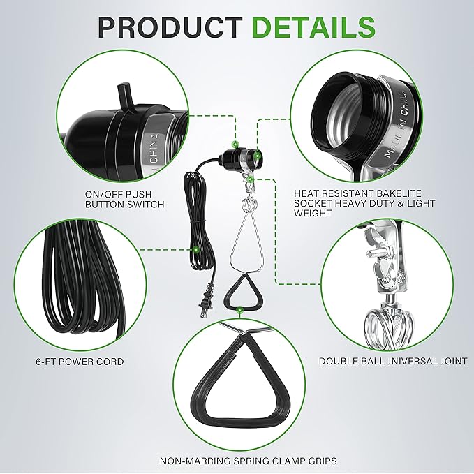 - Heat resistant socket: This brooder clamp lamp comes with a heat resistant bakelite socket, that's more durable and able to withstand heat better than conventional sockets.