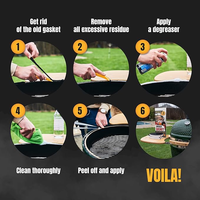 - ✔️ [ HI TEMP RESISTANCE ] With strong adhesion, the self-adhesive BBQ high heat gasket for smokers is easy to stick and apply and fits the most grills: 1. Scrape / Remove the old gasket; 2. Clean and degrease the surface; 3. Peel off safe-adhesive backing (as the adhesive might be very strong, you can use an oblique cut to get rid of the paper backing); 4. Stick the gasket around the edge of the Grill and its lid; 5. Cut the excessive length; 6. Close the lid and wait for 12 hours.