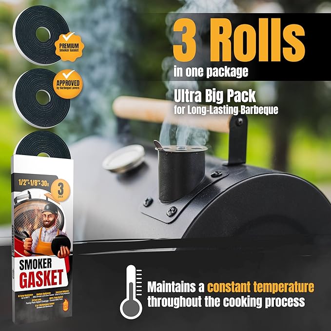 - ✔️ [ UNIVERSAL SIZE ] Our 3 rolls Smoker Chef grill gaskets for smokers are 30 FEET long in total, 10 FEET each, which will ensure a higher coverage. It is suitable for a large variety of BBQ Smokers/grills. It is compatible with Masterbuilt, Weber Smoker, Traeger, Char-Griller Charcoal grill, Kettle Charcoal grill, Oklahoma Joe, Camp Chef pellet smoker, etc. Choose our high temperature gasket smoker for good & durable results compared to other nomex gaskets.