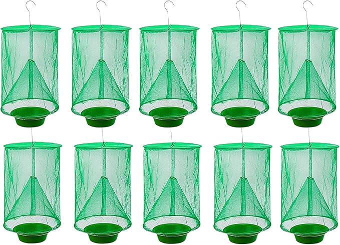 Ranch Fly Trap Outdoor Hanging Reusable with Fishing Apparatus | Food Bait Tray Catcher Cage for Indoor or Outdoor Family Farms, Park (10 Pack)