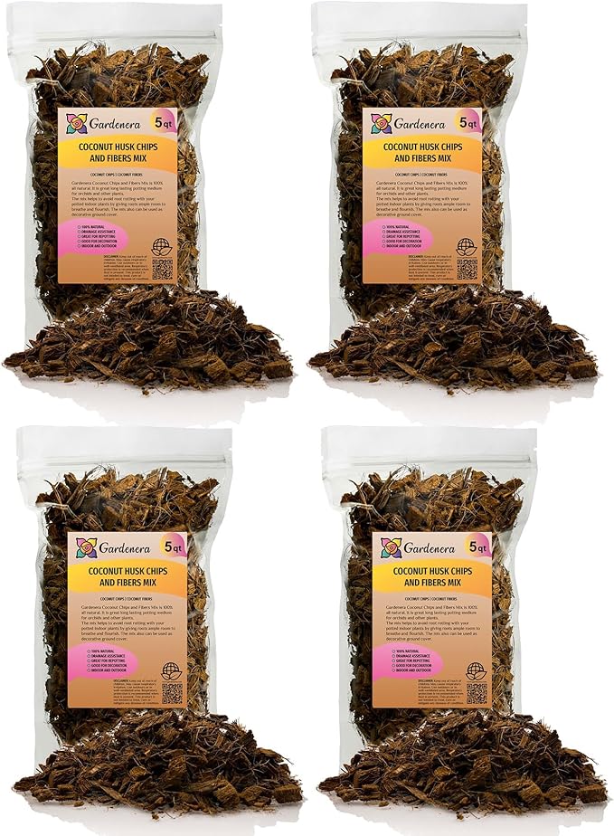 Premium Coconut Husk Chips and Fibers Mix for Orchids - 20 Quart - Houseplant, Monstera and Fiddle Leaf Fig by GARDENERA (4 Bags of 5 Quart)