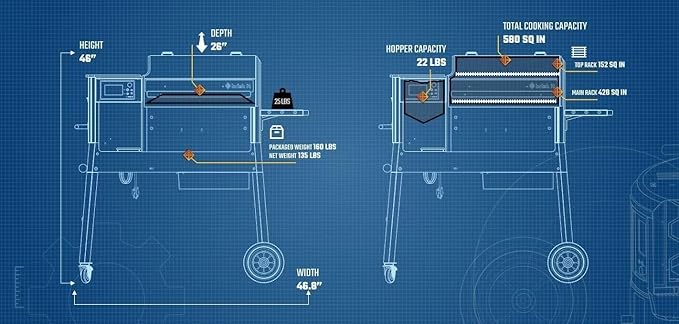 - Durable, Spacious Design – Origin-580 Electric Pellet Grill offers 580 sq. in. cooking space—enough for 15 burgers or 2 rib racks. Built tough with weather-resistant steel, rugged wheels, meat probe, and optional cover for year-round outdoor use.