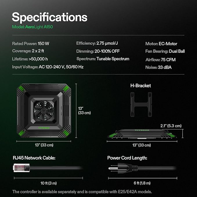 - Integrated Circulation Fan: The centrally located circulation fan in the LED balances airflow where other fans cannot reach, allowing more air to enter the canopy directly and balancing temp and humidity; To unlock additional features, the fan must be used with the Vivosun Growhub Controller (E42A/E25), available for separate purchase