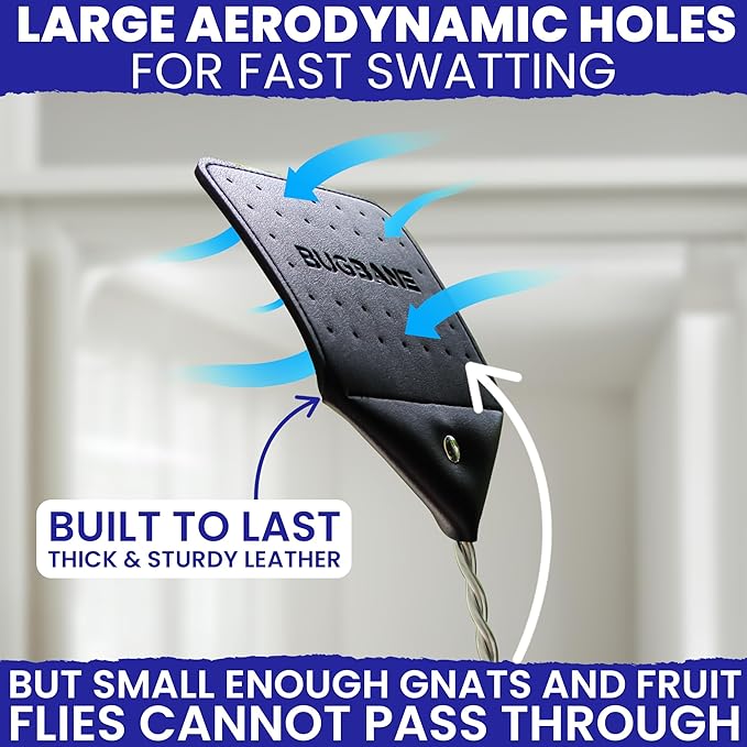 - SWAT ON ANY SURFACE. The soft fly swatter leather head will flatten bugs on any surface, unlike a manual plastic fly swatter. Bee, wasp, mosquito, fruit fly, gnat - nothing will escape!