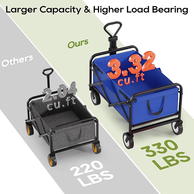- Strong Frame: The collapsible wagon adopts reinforced spray plastic bracket, which bears 330 pounds and is not easy to rust, which can ensure that you can use it for a long time.The lounge wagon with durable 600 Denier oxford fabric can carry a significant number of items and kids toys. Please note that the product cannot be used as a kids wagon.