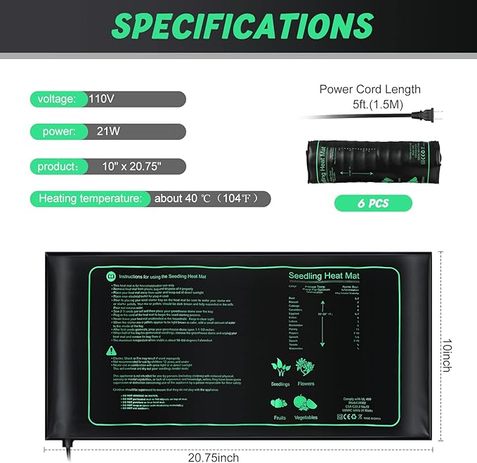 - Compact, Easy to Store: this 10 x 20.75" seedling heat mat for starting seed is lightweight and flexible; Simply roll it up and wrap the cord for storage without taking up much space, convenient for repeated use in greenhouses, indoor gardens, or home planting
