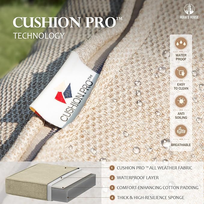 - 【ALL WEATHER USE】Special CUSHION PRO technology applied on the fabric of this conversation set. It makes the dirts be easily wiped down. Water-proof and oil-proof perfectly for all seasons use.