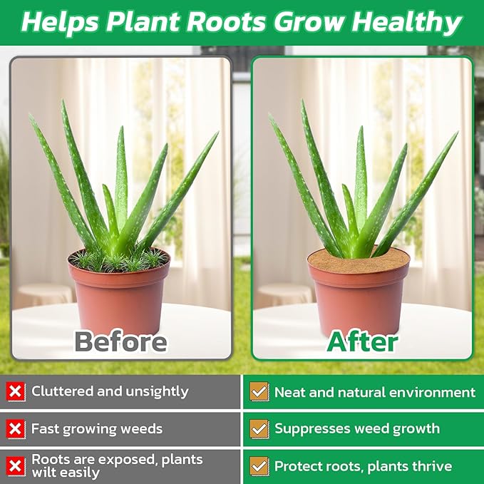 - GREAT Endurance & Moisturization: Our coco mulch disc ring is 1/4" thick, coco mat is the perfect way to mulch the plants to aid in holding water, it can well maintain the moisture of soil in the plant pots, keep the plant needed moisture and mimeral and prevent plants from drying out