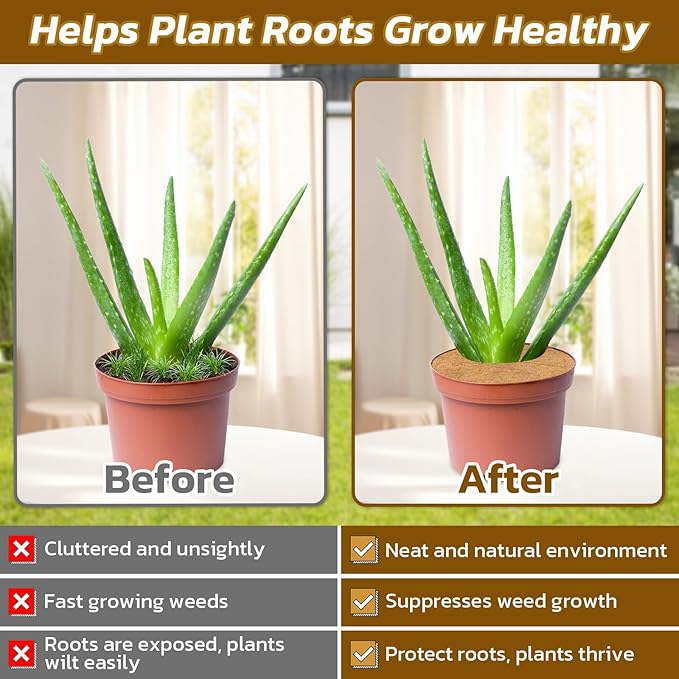 - GREAT Endurance & Moisturization: Our coco mulch disc ring is 1/4" thick, coco mat is the perfect way to mulch the plants to aid in holding water, it can well maintain the moisture of soil in the plant pots, keep the plant needed moisture and mimeral and prevent plants from drying out