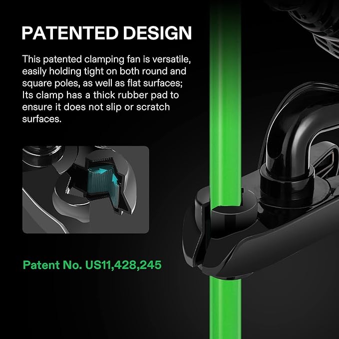 - Patented Design: This patented clamping fan can easily hold tight on round, square poles, and flat surfaces; Its clamp has a thick rubber pad to ensure it does not slip or scratch surfaces