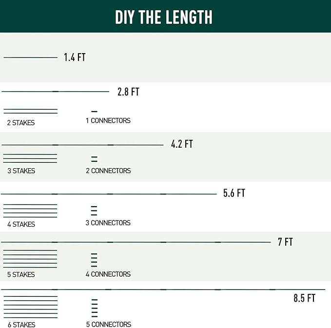 - 【DIY Kit】 This kit contains 80 stakes, each 17" in length and 0.335" in diameter, along with 56 connectors, 56 rotatable clips, 56 plant clips, and 1 roll of twist tie. You can connect two or more stakes to achieve the desired length.