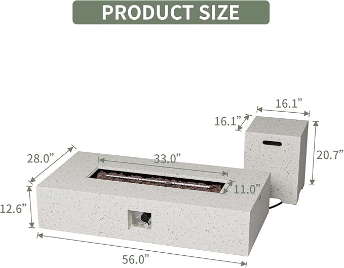 - 🔥 【Spacial Economy 】: Large enough coffee table surface to set your brandy snifters and keep them warm as the evening lingers on. The unit is 56-inch long with 28-inch wide and just 12-inch from the ground for an almost sunken feeling. The fire bowl itself is 36-inch long and 9-inch wide. The tank cover has a 16-inch square footprint and is 20-inch from the ground, a perfect size for a modern deck! They don't call us "COSIEST" for nothing!