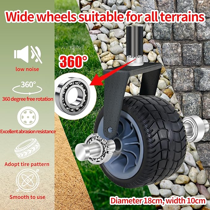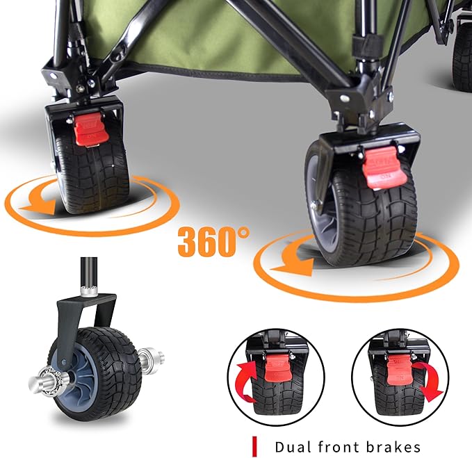 - All Terrain Wheels:This collapsible wagon is equipped with wide and large wheels , which can roll smoothly and ensure a good performance on beach, grass, gravel and muddy road. Double bearings in each wheels, ensure the large capacity and a stable operation. This wagon cart front wheels are designed with 360° rotating to make sure they can move smoothly on different kinds of terrains.