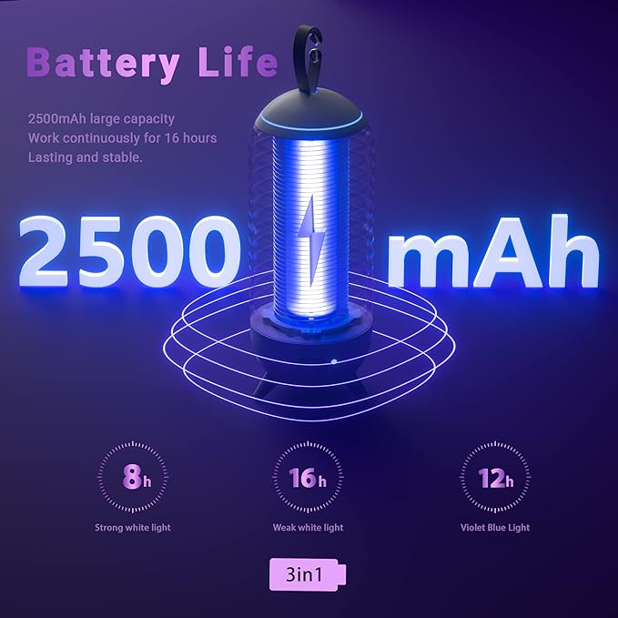 - [2500mAh high-capacity battery] It can be charged quickly and easily via micro USB, and the 2500mAh can last up to 16 hours of operation. You can take it with you and put it anywhere, no wires are needed. Just turn on the power to attract a large number of insects and end it immediately with a high-voltage electric shock.