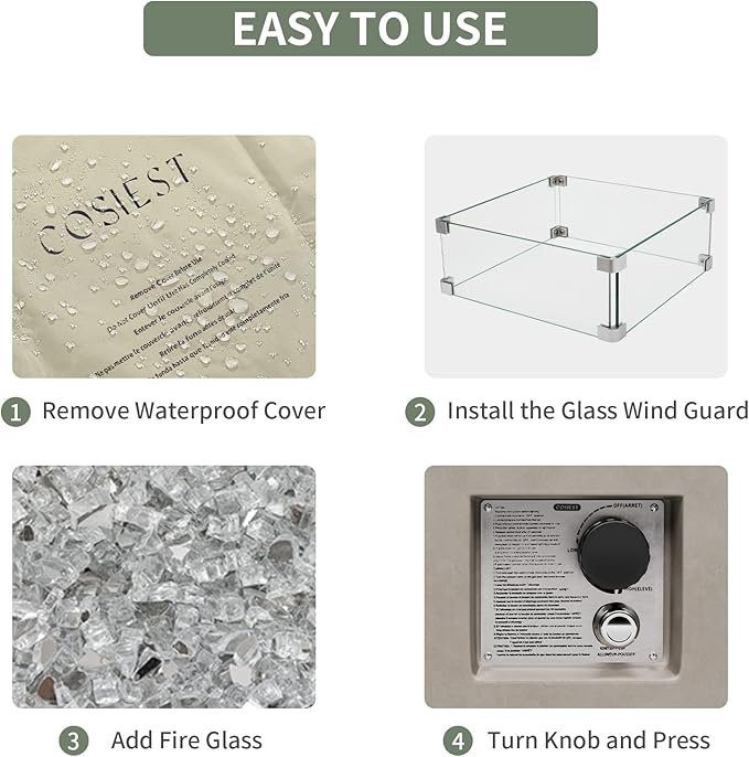 - ๐ฅ ใ Transparent Gray Fire Glass ใ: Transparent Gray fire glass pieces fill the burner bowl and adds a different color to this fire table. No soot or ash to clean up and no smoke as with wood burning or charcoal. Clean burning propane stays lit with no smoking and is better for the environment. The unit comes with a heavy duty waterproof cover to keep it clean and dry when not in use. Built-in side handles for easily moving. Wind guard and waterproof cover for protecting.