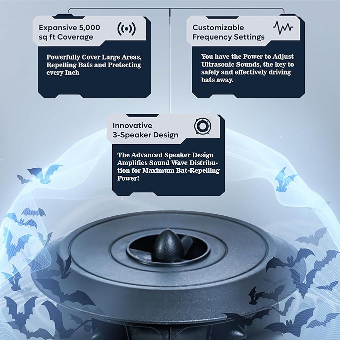- Bat Prevention and Safe Bat Removal: Unleash the full power of bat repelling with our cutting-edge device, capable of covering open areas up to a staggering 5000 Square feet.