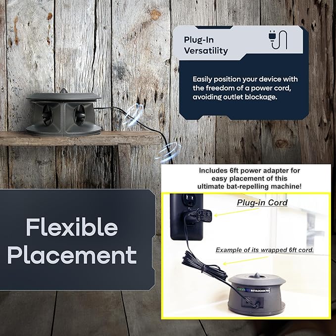 - Bat Exclusion Effortless Setup and Use: Our ultrasonic bat repeller comes with a 6-foot plug-in adaptor, making it easy to position and start using right away.