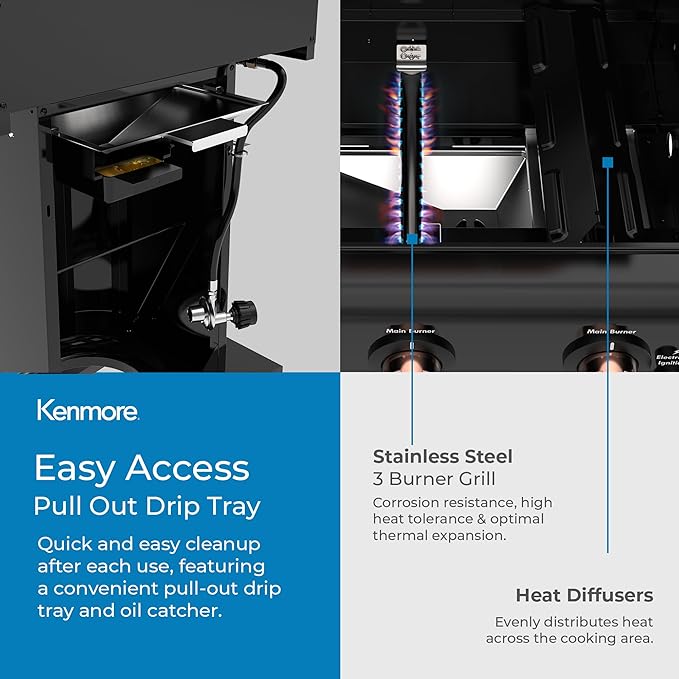 - 4 CASTER WHEELS FOR EASY MOBILITY β Who needs muscles when you've got wheels? The Kenmore 3-Burner Gas Grill comes equipped with 4 smooth-rolling wheels, 2 of which lock for added security and stability. No heavy lifting required! Take this grill on the go and lock it into place wherever you desire. Whether you're grilling up a storm on your backyard patio or taking it on the road to your next tailgate, this grill's got your back.