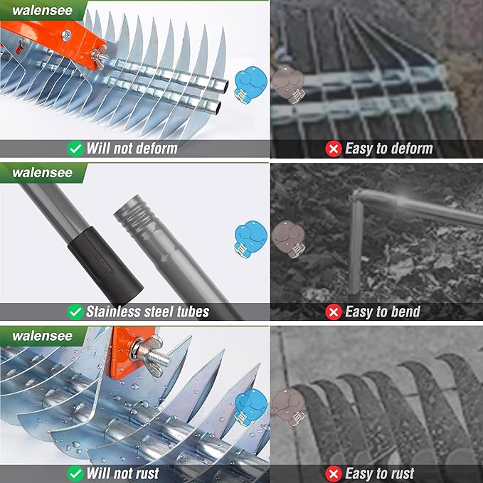 - Maintaining Lawn Health and Aesthetics: The Walensee Thatch Rake is designed to effectively remove thatch layers, and it can also assist you in cleaning up fallen leaves, branches, and other debris from your lawn. This allows the lawn to absorb air and sunlight more effectively, promoting its healthy growth and keeps your lawn neat and tidy. The ergonomically designed handle provides sufficient leverage, making it easy to clear dead grass and relieve your back strain.