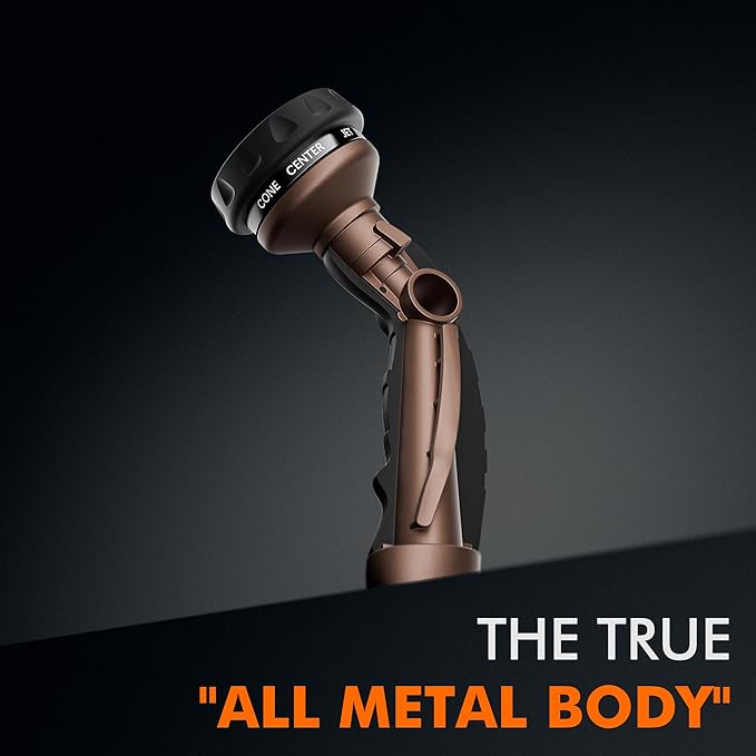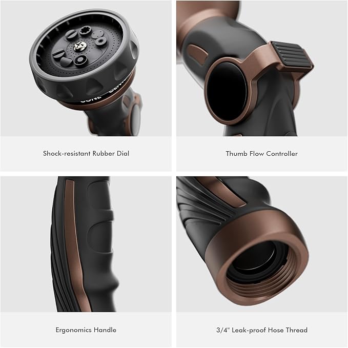 - 【Heavy Duty Metal Hose Nozzle】Constructed with premium zinc-alloy material, this hose nozzle sprayer is solid & strong to resist daily drops and shocks. The bronze powder painting, TPU coating and rubberized bezel dial can enhance durability & flexibility and withstand hard impacts & heavy force. A long-lasting garden hose nozzle you can count on many years.