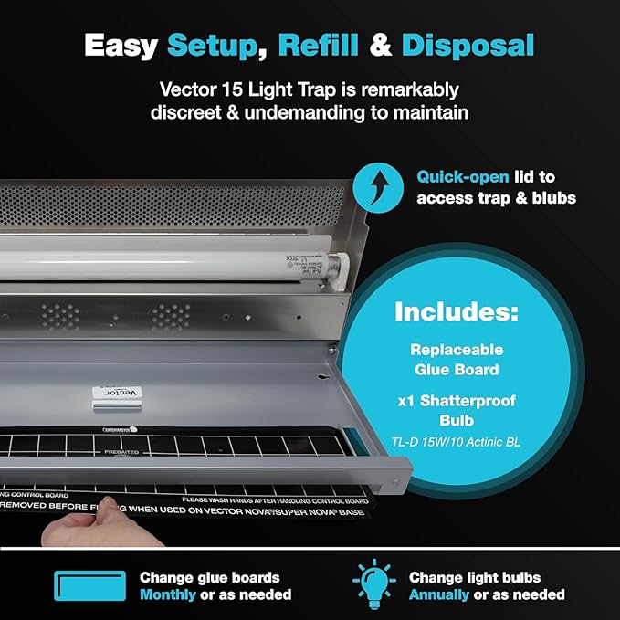 - INDUSTRIAL STRENGTH UV TRAP: Catchmaster's Insect Vector 30 Light Trap is remarkably discreet and undemanding to maintain. It's made with airplane-grade aluminum casing and an industrial-strength design for increased durability. This ultra-sturdy indoor fly trap for home comes with a replaceable glue board and 2 shatterproof 15-Watt bulbs (Philips TL-D 15W Actinic BL)