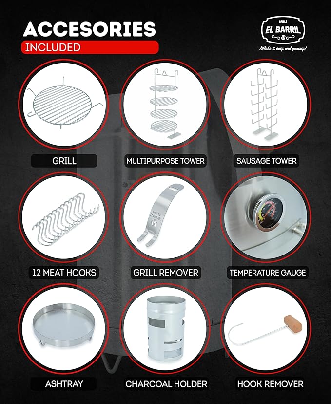 - All In One: Our 30lbs portable Smoker & Grill Barrel with heat resistant handles, comes with 12 Hooks, 1 Hook Remover, 4-tier Sausage Cooking Tower & Multipurpose Cooking Tower each, 1 Grill & its remover, 1 Ventilated Stainless Steel Charcoal Holder & Ashtray, a Temperature Gauge and cover top with Hook