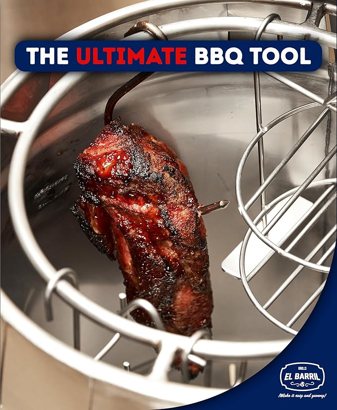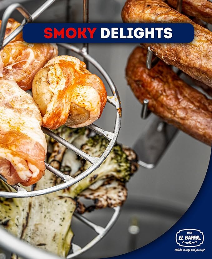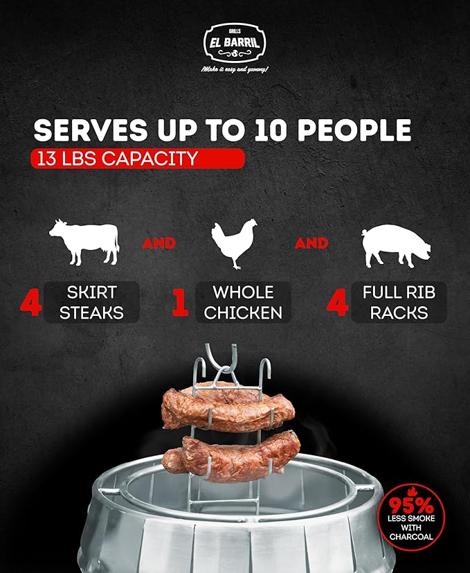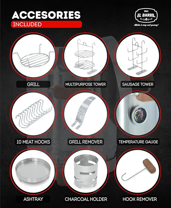- Small & Handy: El BARRIL 13lbs Portable Charcoal Grill Barrel with heatproof handles, comes with 10 Hooks, 1 Hook Remover, 1 Small Sausage Cooking Tower, 1 Small Multipurpose Cooking Tower, 1 Grill & its remover, 1 Ventilated Stainless Steel Charcoal Holder & Ashtray, a Temperature Gauge and cover top with hook