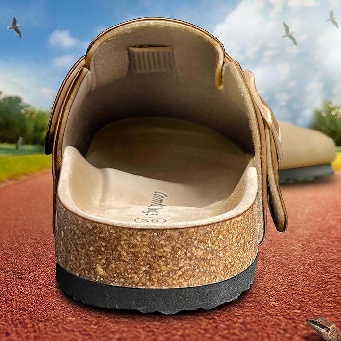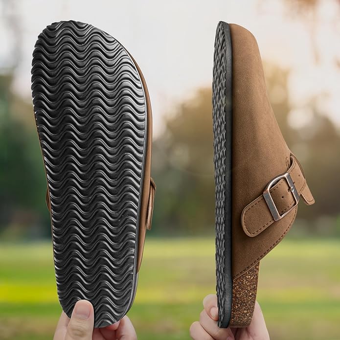 - SUPPORTIVE--CUShioned sole with cork-footbed and Super soft insole of sueded PU;