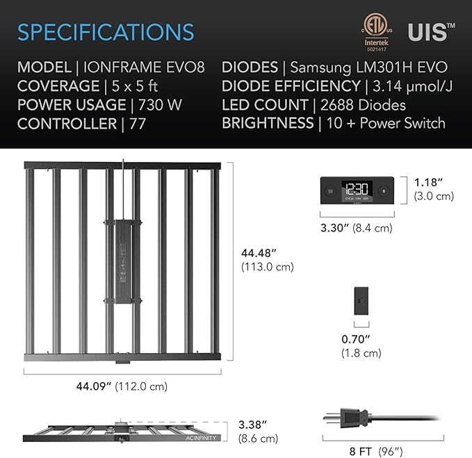 AC Infinity IONFRAME EVO8, Samsung LM301H EVO Bar LED Grow Light 5x5, 2688 Diodes, with Schedule Controller, 730W Full-Spectrum Commercial Plant Lights for Indoor Growing in Grow Rooms & Greenhouses