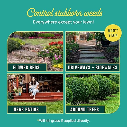 - NOT FOR YOUR LAWN: It’s non-staining, but it’s also non-selective -- so don’t use it on your lawn. For use in flower beds, near patios, along sidewalks, in mulched areas, and more.