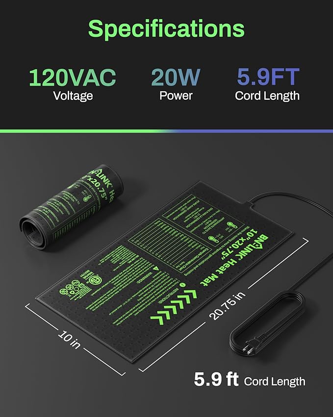 - SAFETY & RELIABILITY: ETL Listed for quality assurance, this 10" x 20.75" heating pad for plants germination with a 5.9ft power cord fits standard 1020 trays and runs on just 20W. Rolls up easily for storage without taking up space. Backed by BN-LINK’s 15-month warranty for added peace of mind.