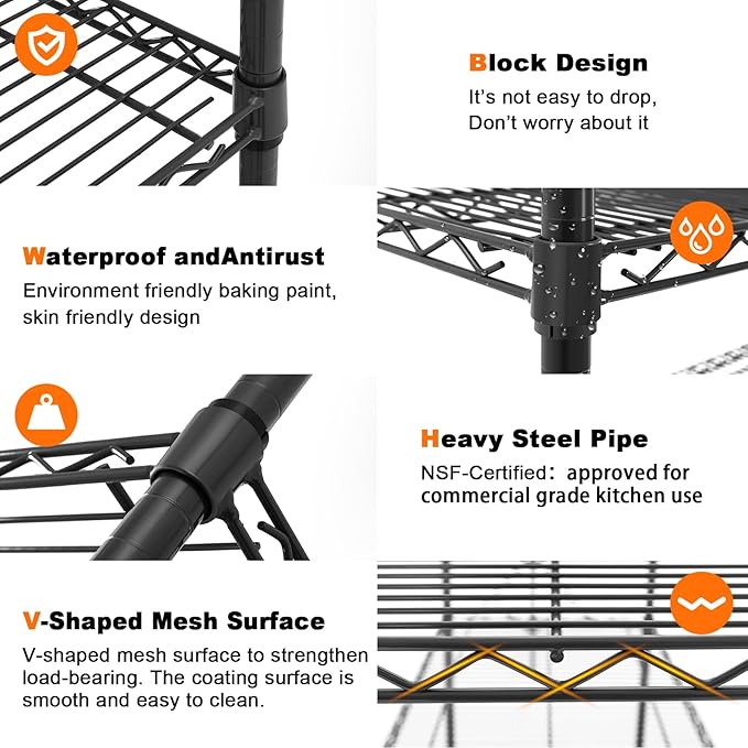 - 【EASY TO ASSEMBLY】: The storage rack is designed very simply, very easy to assemble, no assembly tools are required when assembling the metal shelf, even if you assemble it separately, the wire shelf unit can be handled quickly. With detailed instructions and no tools required, you can easily install it with others within 15 minutes.