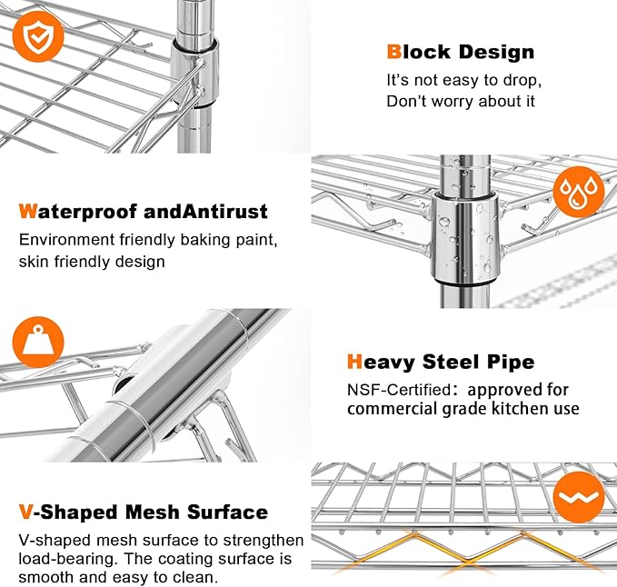 - 【HIGH-QUALITY MATERIAL Chrome】: This Chrome metal shelf is made of heavy steel, so it has extremely strong load-bearing capacity. The metal rack is covered with a powder coat finish that not only has a smooth finish, but also resists water, rust or corrosion. Placing the shelving unit in your kitchen or laundry room is no problem.