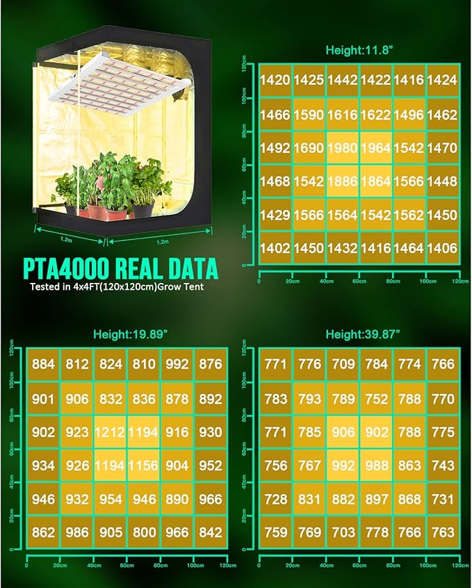 - 【High Efficiency and Low Energy Consumption】- SZHLUX LED Grow Light utilize the latest in high yielding LEDs technology diodes, high Energy Efficiency with 2.9 Umol/J, delivers powerful light output and uniform canopy penetration to resulting maximum higher yields. Actual power is 400W with 972 LEDS, effective footprint is 4 x 4 ft.