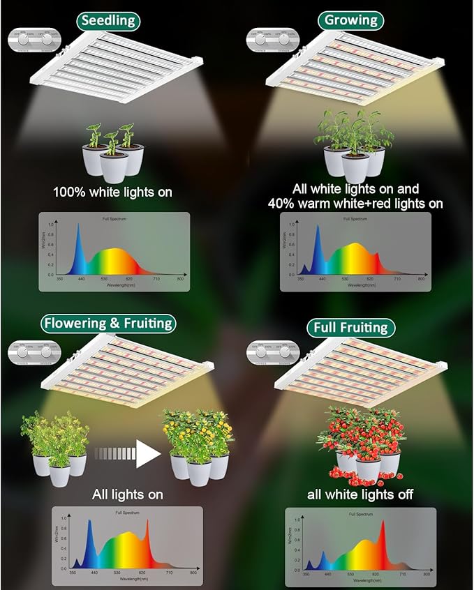 - 【2023 Upgraded Dimmer Modes】- This upgraded light has 4 dimmer modes for different growing stage, plants will get absolutely full spectrum nutrition. If you turn to 40% for the first dimmer switch, 5 white light bars will on; If you turn to 100%, all white LEDs will on, it’s best for seedling and growing. If you turn to 40% for the 2nd dimmer switch, 4 light bars will on with warm white, red and IR LEDs; If you turn to 100%, all light bars will on, it’s most suitable for blooming and fruiting.