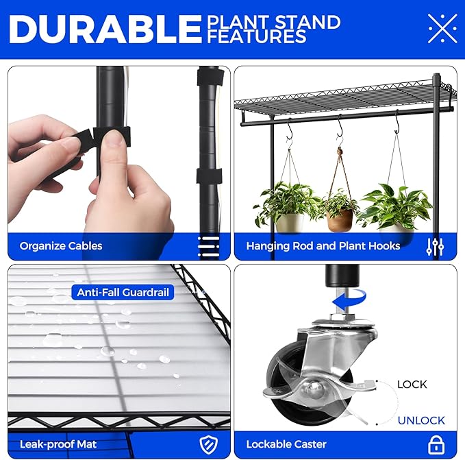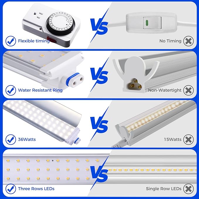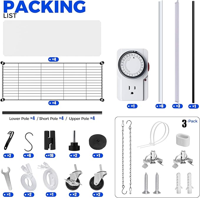 - What You Get: 3 X 35.4" grow lights for plant shelf, 2 X 48" connecting cables, 1 X mechanical timer๏ผ1 X storage tape, 4 X wire racks, 4 X PP pads, 3 X T5 grow light accessory kits, 1 X plant stand accessory kit
