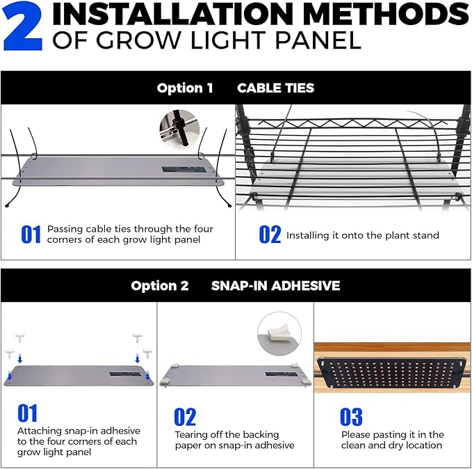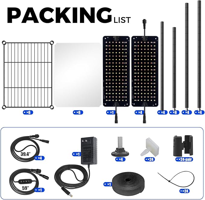 - What You Get: 5 x Barrina Grow Light Panel, 1 x AC/DC Adaptor, 1 x Power Cord with Turn On/Off Timer, 4 x Connecting Cord, 1 x Hook and Loop Tape, 24 x Snap-in Adhesive, 24 x Cable Tie, 6 x wire shelf, 6 x PP pad, 1 x Accessory Kit for Plant Shelf, 1 x Installation Manual