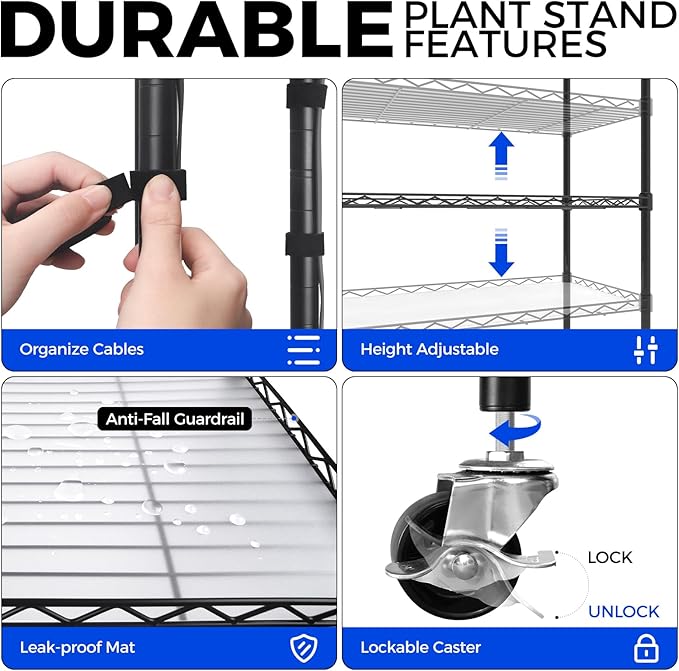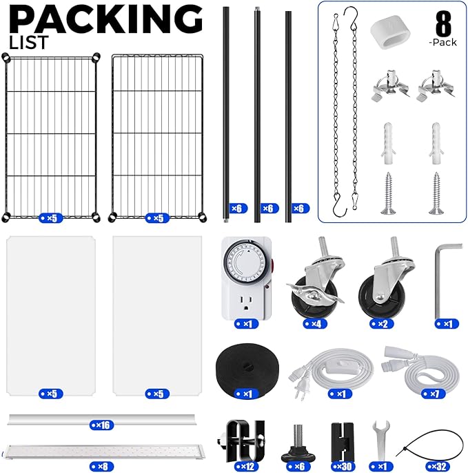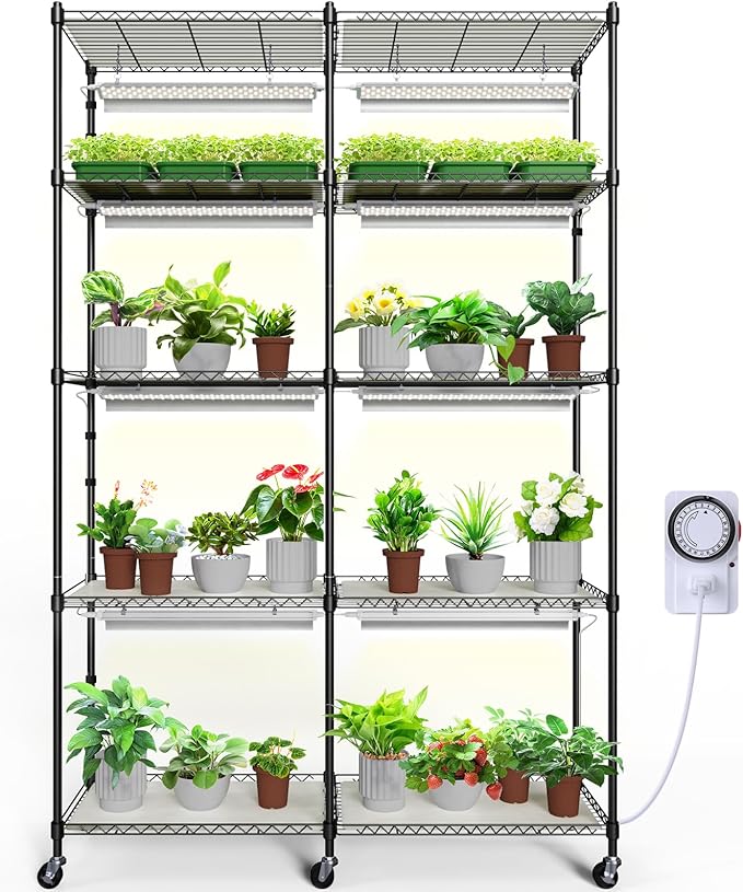 - 5000K Full Spectrum Grow Light & Timer: The metal plant stand comes with 8pcs of 1.6ft T5 LED Grow Lights to meet your plants' requirements in all growth stages. Each plant light is equipped with reflectors for enhanced efficiency, promoting plant growth, and eye protection. Additionally, the mechanical timer can be programmed to repeat your daily schedule based on your preferences