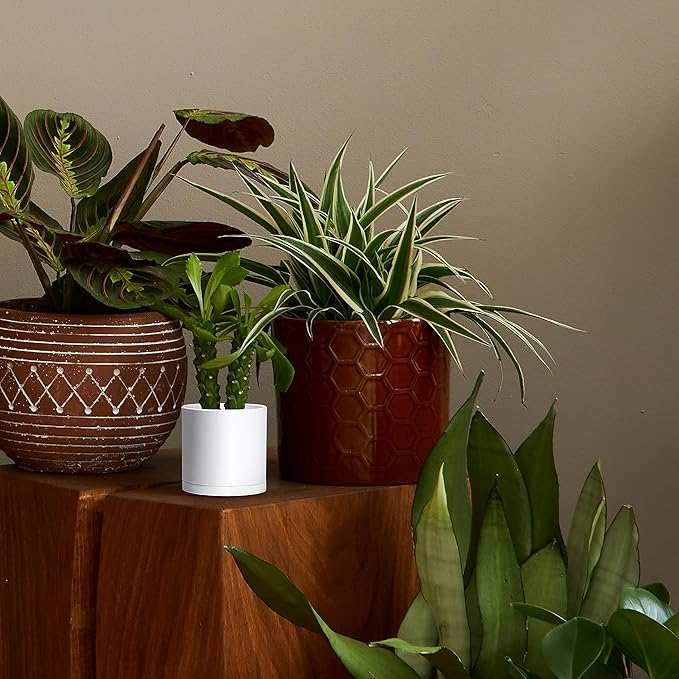 D'vine Dev 6 Pack 4.5 Inch Modern Plastic Plant Pots, Small Garden Planters for Plant with Drainage Holes and Saucers, White Color, 74-Z-F-3