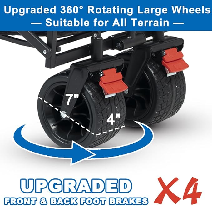 - 🛒Stable & Safe Foldable Wagons: 360° universal 4" widened and 7" diameter large all-terrain wheels, no matter on the beach, grass, gravel road or bad road conditions, it can drive stably and bring you a more comfortable experience. Equipped with 4 foot brakes, it can help us control the cart more easily and keep the stability of the cart, improving the safety of us.