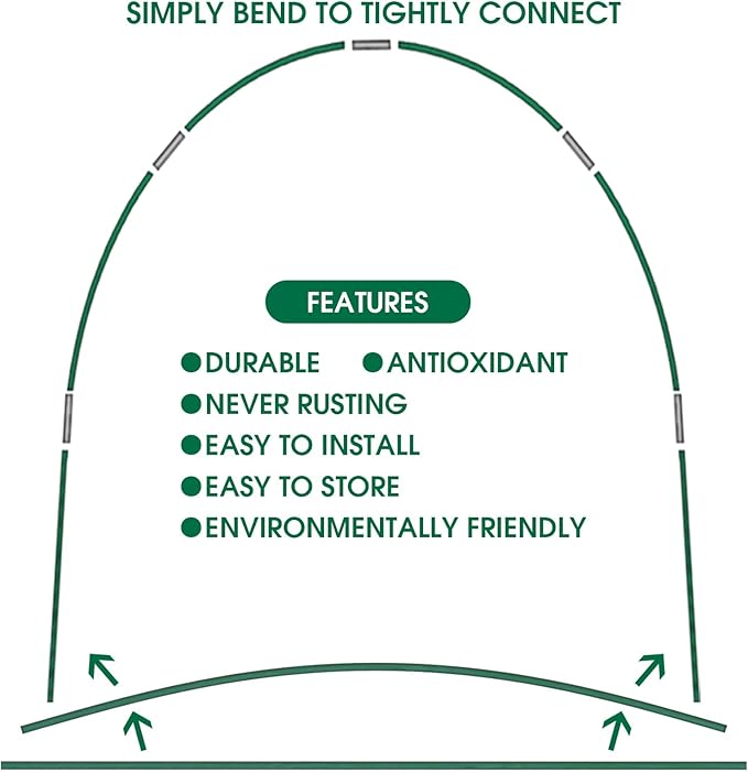 - Easy to Assemble: No special tools required! Simply insert the garden hoops into the soil, connect a certain number of garden hoops with connectors according to your needs, simply bend the garden hoop, insert the other side into the soil and cover with garden netting or greenhouse netting secured with clips.