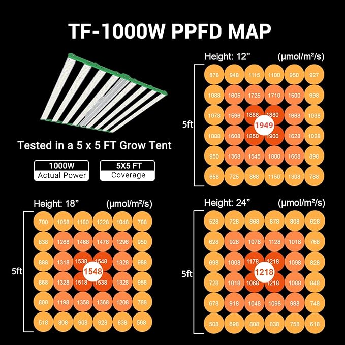 - Enhanced size and uniform PPFD: Growline1000’s enlarged frame ensures light is distributed more evenly, reaching the farthest corners of your plants. By placing diodes at the end of each strip, it provides balanced intensity, promoting healthier, more uniform growth.1000W Commercial Grow Light is designed to cover a 5x5 grow area, ensuring even light distribution, high brightness and low temperature.