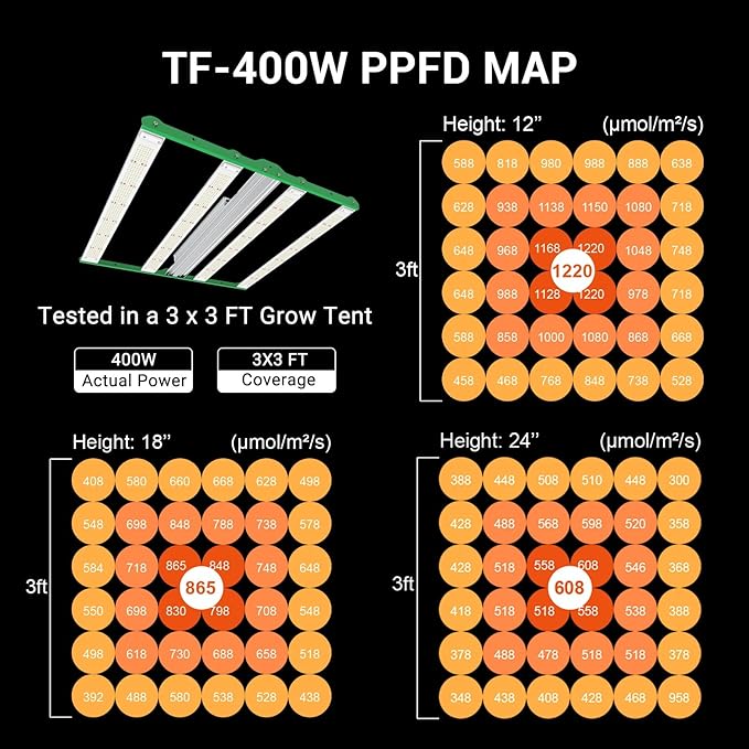- High Quality 400W LED Grow Lights: Features LM281B+ LEDs and EPI 660nm 45mil LEDs for high PAR output and improved light penetration. Provides energy efficiency of 2.6-2.8 umol/J, maximizing plant growth in a 3x3 area.