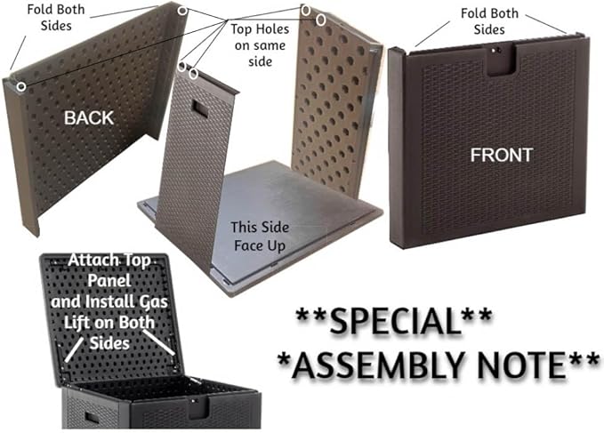 - NO NONSENSE ASSEMBLY AND EASY TO CLEAN: Comes with detail instruction or video instructions available to assemble the patio storage box. Before you insert side panels. Three Top holes on the back & side panel (each side) should align on same side. Back & Front to be folded from sides. See Video for more information. Tighten all the parts and properly screwed to locked for durability and water proof. Dimension: 31.50"(L)x56.30"(W)x28.10"(H) , 500lb weight Capacity