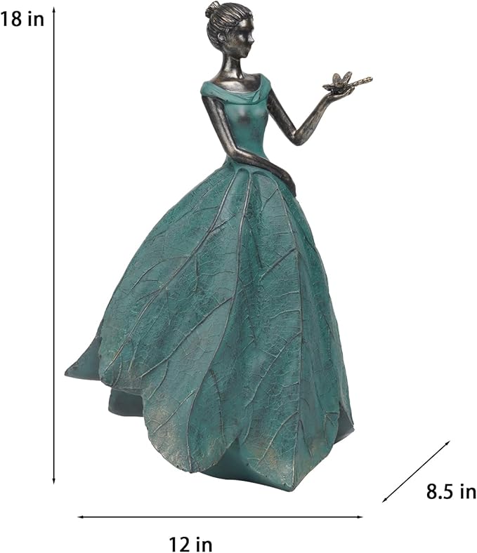 - Fairy Statue: Do you think your garden is too drab? Our leaf Angel girl statue with dragonfly product is originally designed by the designer. The skirt is in the shape of a leaf with the delicate texture of a leaf, which looks very artistic. It can add a different aesthetic feeling to your room or garden.
