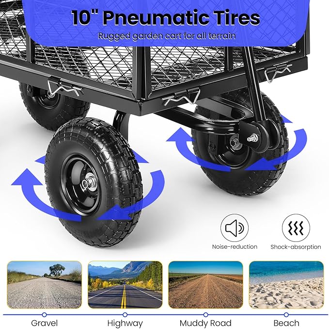 - Smooth & Quiet Ride with Inflatable Tires – Our garden wagon features 10-inch noise-reducing, air-filled tires that glide effortlessly over gravel, grass, or uneven terrain. This garden cart on wheels ensures a smooth and quiet experience, whether you're working in the garden or taking it to a tailgate party