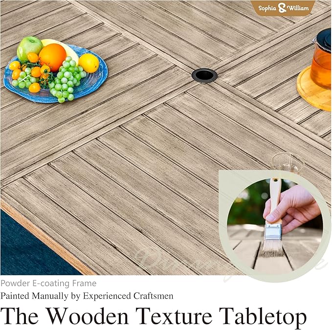 - Spacious 8-Person Dining Table: Black iron square dining table with painted tabletop, designed to comfortably seat 8 guests. Table Size: 60"L x 60"W x 29"H. Rust-resistant, ensuring lasting durability. With a 1.57" - 1.9" adjustable umbrella hole, you can easily add shade for sunny days, making every meal feel special